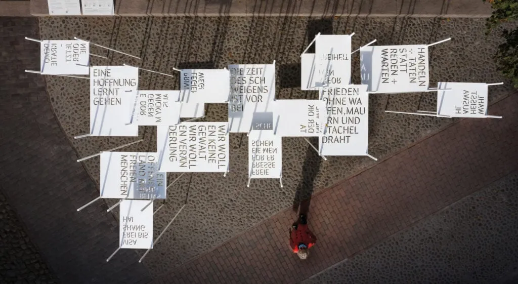 Thought up by artistic duo Dagmar Korintenberg and Wolf Kipper, this pavilion-like installation aims to make the slogans of the Die Wende visible again in public space, as a tangible reminder of Germany’s (recent) fraught history. Images of the protest in 1989 are made available via an augmented reality app, so that visitors can point their devices up to the laser-cut lettering in the sky and observe the archival images—and they can even add their own contemporary photographs to the mix.